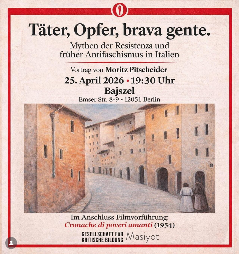 25.04.26 Moritz Pitscheider: Täter, Opfer, Brava Gente. Mythen der Resistenza und früher Antifaschismus. Mit Filmvorführung.